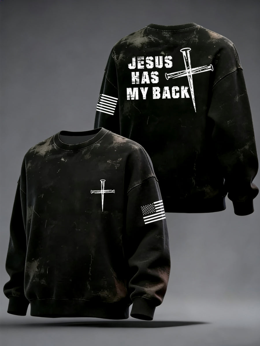Men's Retro Jesus Has My Back Cross Faith USA Flag Print Casual Sweatshirt